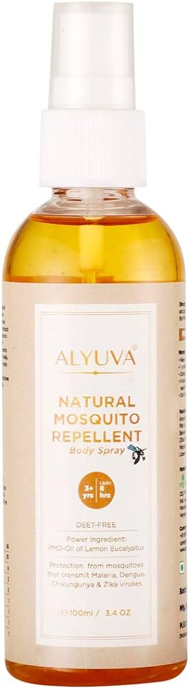 Alyuva’s Natural Mosquito Repellent is an authentic Ayurvedic formulation which protects against mosquitoes which transmit viruses that cause Malaria, Dengue, Chikungunya & Zika. The product is made from natural ingredients and is DEET FREE. It is totally safe for children above 3 years of age. The product is effective up to 8 hours after application and hence you do not have to apply it again and again. The product is powered by the oil of Lemon Eucalyptus, which is refined to increase PMD content up to 70%. Other insects repelling ingredients include essential oils of Citronella, Lavender, Thyme, Lemon Grass and Peppermint. It is also enriched with the goodness of Coconut oil to keep your skin moisturised at all times. It protects against not only mosquitoes but also against other insects like flies, ticks and bugs.