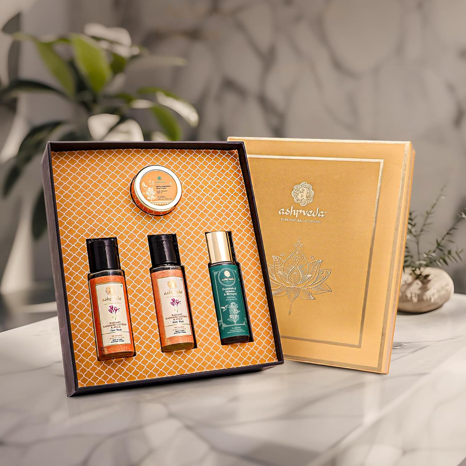 The Cleanse & Hydrate Kit includes a refreshing Face Wash, invigorating Body Wash, nourishing Bhringraj Shampoo, and a protective Day Cream with SPF 25. This all-in-one set is designed to cleanse, hydrate, and protect your skin and hair, ensuring a fresh and radiant feel throughout the day.