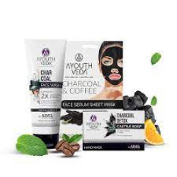 Ayouthveda Skin Detox Regimen. It consists of three powerful formulations: Charcoal Detox Soap, Charcoal Face Wash, and Charcoal & Coffee Face Serum Sheet Mask. This innovative regimen combines the power of Ayurveda with modern skincare technology to bring you a deep-cleansing and rejuvenating experience. It draws out impurities, nourishes the skin with its blend of herbal oils, refines pores, exfoliates dead skin cells, and protects against pollution. Additionally, it provides deep hydration and purification, leaving your skin feeling refreshed and firm. Try the Ayouthveda Skin Detox Regimen today and experience the benefits of detoxified skin every day.