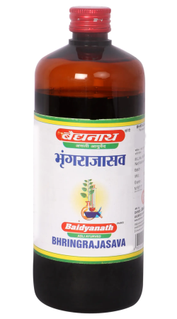 "Bhringrajasava, a traditional Ayurvedic formulation, comprises potent ingredients such as Bhringraj Ras (Eclipta alba), Chaturjaat, Haritaki, Pippali, Jatiphala, and Jaggery. Chaturjat Churna, another significant component, combines Dalchini (bark of Cinamonum zeylanicum), Ela (seeds of Elletaria cardamomum), Tejpatta (leaves of Cinnamomum tamala), and Nagkesar (flowers of Mesua ferrea). Bhringraj, renowned for its hair care properties, also contributes to improved digestion. When combined with the chaturjaat ingredients, it fosters the well-being of hepatic cells and enhances appetite. Additionally, Haritaki plays a crucial role in shielding bowel cells and promoting smooth digestion."