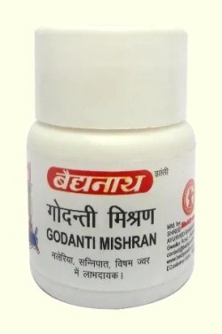 Baidyanath (Jhansi) Godanti Mishran Tablet is an ayurvedic medicine that is primarily used for the treatment of fever and body pain. The key ingredients of Baidyanath Godanti Mishran are camphor, pipli, godanti bhasma and shring bhasma. The correct dosage of Baidyanath Godanti Mishran depends on the patient's age, gender, and medical history.