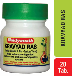 Baidyanath (Jhansi) Kravyad Ras Tablet is a herbomineral Ayurvedic medicine. It is useful in treating week digestion, fever and respiratory diseases due to increased vata in the body. The intake of this medicine after having heavy meals helps in faster digestion. It is also good for diseases of abdomen, liver and lung.