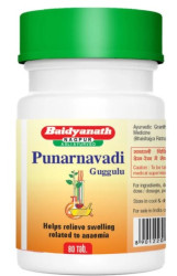 Baidyanath Punarnavadi Guggulu Tablet is a herbal medicine used as a diuretic and for edema treatment. It improves blood circulation, relieves inflammation and exerts protective effects on the heart, kidneys, and liver. It helps to balance the fluid accumulation in cells, tissues, or serous cavities. Therefore, it can be used in all types of diseases, which result in abnormal accumulation in the body. It acts as a pain reliever and is anti-inflammatory without any known side effects.