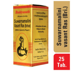 Suwarnamalini Vasant Ras is a time-tested Ayurvedic medicine enriched with gold and pearl, known for its natural immunity enhancer and antibiotic activity. It helps to alleviate weakness and provides strength to the body.