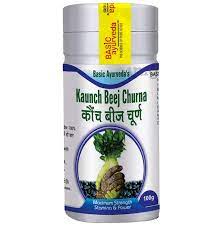 Basic Ayurveda Kaunch Beej Churna is a very effective herb for sexual weakness. kaunch beej is an Indian jadibooti. Its botanical name is Mucuna pruriens. It is widespread over most of the subcontinent and is found in bushes and hedges and dry-deciduous, low forests throughout the plains of India. It has been used since ancient times to increase sexual libido.