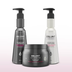 Dullness gone, Intense Shine on with BBLUNT Intense Shine Kit. This kit has everything you need to achieve that salon-like shiny hair. It cleanses, nourishes, and conditions your hair leaving it smoother, shinier, and softer. The kit comes with Intense Shine Shampoo, Conditioner and Hair Mask.