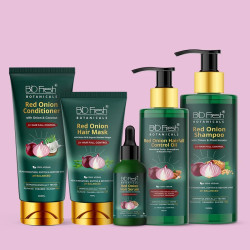 BIOFRESHBOTANICALS complete RED ONION HAIRFALL CONTROL RANGE is a rescue from weakening ,hair thinning ,frizziness,and excessive hair fall in this monsoon season.With its best kept nature secret 100% natural red onion extract and plant keratin that revives dull and frizzy hair and restores optimal hair nourishment. Follow a weekly routine by massaging red onion hair oil prior 1hour before shampooing ,apply hair mask and wrap a hot towel leave it for 10 to 15mins then wash followed by anti hairfall hair serum genly massaged in the roots after semi drying hair.This powerpack is a complete hairgrowth and anti hairfall treatment specially for monsoon season.