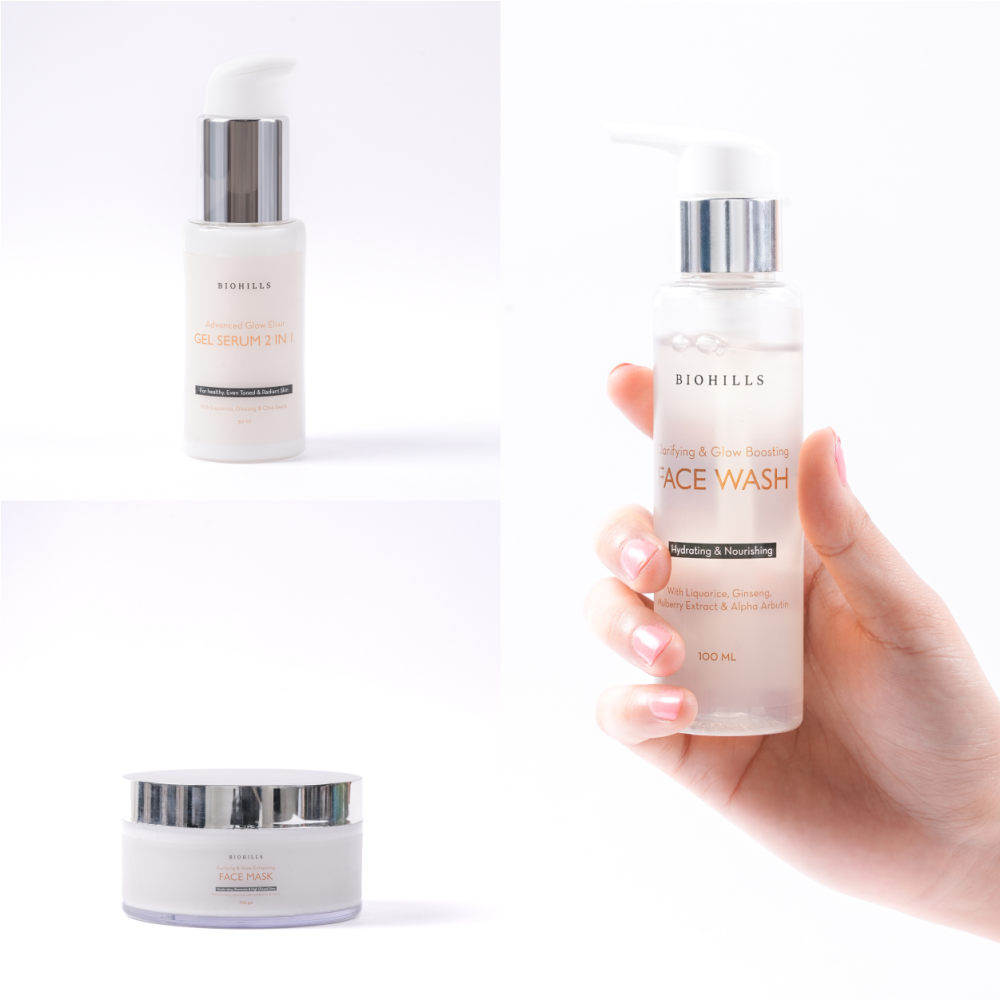 Introducing Biohills Clarifying & Glow Boosting Face Wash, your key to glowing, glassy skin. Formulated with the power of Ginseng, Mulberry Extract, orange peel extract, Alpha Arbutin, Niacinamide and Liquorice, this face wash is your secret to a naturally glowing skin. Ginseng revitalizes and boosts your skin’s natural glow. Mulberry Extract & Orange peel brightens your complexion, evening out skin tone. Alpha Arbutin & Liquorice reduces dark spots for a clearer, brighter look. Niacinamide & CiCa clarifies and brightens, leaving your skin nourished. Biohills Clarifying & Glow Boosting Face Wash - Clarify, brighten, and glow. Introducing Biohills Advanced Glow Elixir Face Gel Serum, your ultimate skincare solution for radiant, glowing skin. A 2 in 1 face gel serum formulated with the power of Ginseng, Chia Seeds, Alpha Arbutin, Liquorice, Aloevera extract and Niacinamide. Ginseng and Aloevera extract deeply nourish and hydrate, giving your skin a healthy glow. Alpha Arbutin and Liquorice work together to reduce dark spots and hyperpigmentation, giving you a brighter, more even skin tone. With the added benefits of Niacinamide and Chia Seeds, this 2-in-1 serum also improves skin texture and reduces redness, revealing smoother, more even skin. Biohills Advanced Glow Elixir Face Gel Serum. Illuminate your skin, naturally. Introducing Biohills Purifying & Glow Enhancing Face Mask, your ultimate skincare ritual for radiant, glowing skin. Formulated with potent ingredients like Ginseng, Oatmeal Extract, Alpha Arbutin, Vitamin C, Liquorice, and Niacinamide. Ginseng and Oatmeal Extract deeply purify and revitalize the skin, revealing a natural, healthy glow. Alpha Arbutin and Liquorice work together to reduce dark spots and hyperpigmentation, promoting a brighter, more even skin tone. With the added benefits of Vitamin C and Niacinamide, this face mask improves skin texture, reduces redness, and provides antioxidant protection, revealing smoother, more radiant skin. Biohills Purifying & Glow Enhancing Face Mask. Illuminate your skin, naturally.