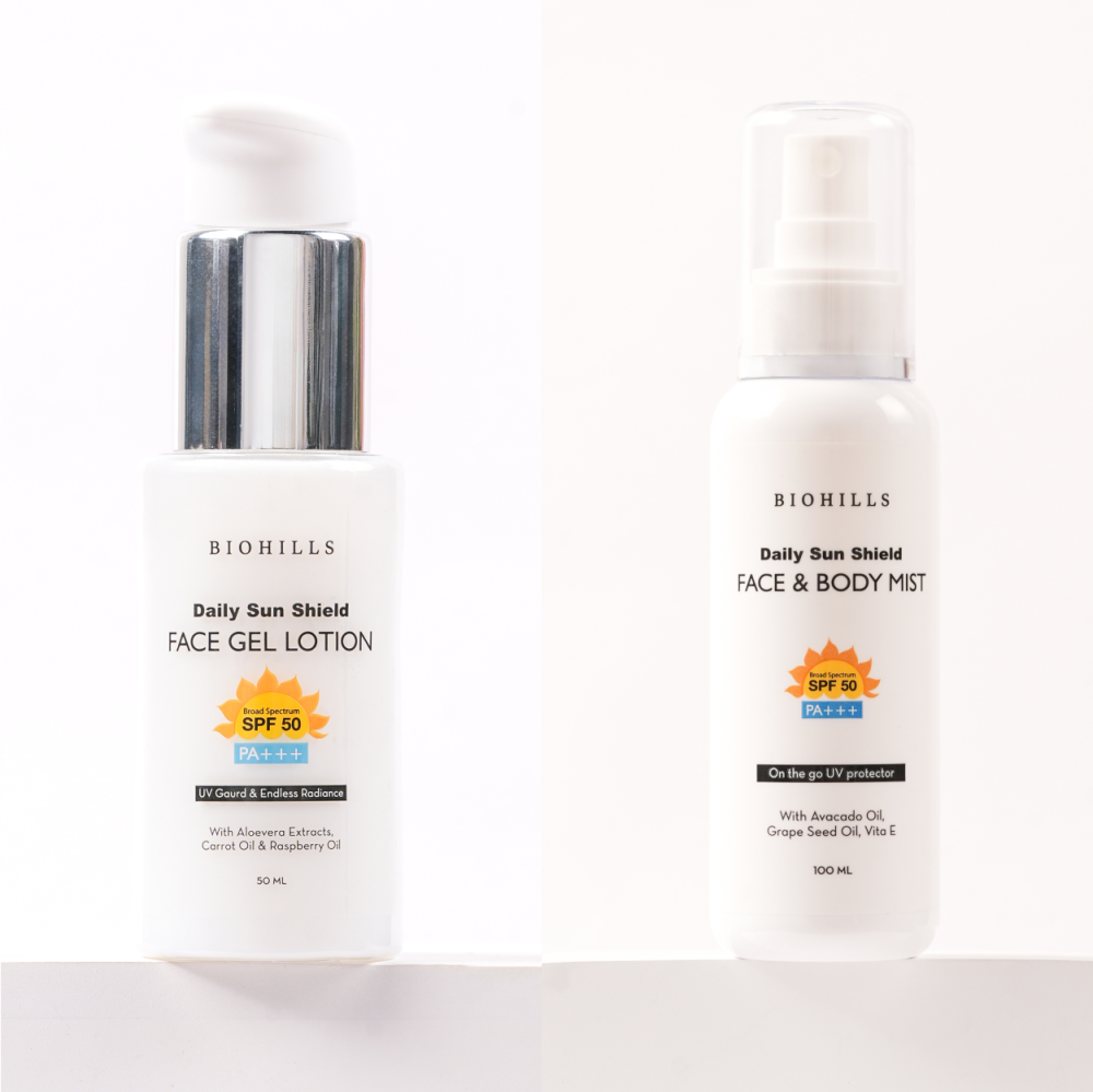 Introducing Biohills Day Sun Shield Face and Body Mist SPF 50 PA+++, your ultimate luxury for on-the-go skin protection. This innovative mist combines the power of grape seed oil and avocado oil to provide moderate SPF protection against harmful UV rays. Niacinamide helps in brightening the skin while providing additional sun defense. Hyaluronic acid keeps your skin hydrated and refreshed throughout the day. With Biohills Day Sun Shield Face and Body Mist, you can enjoy the luxury of sun protection wherever you go. Protect your skin and indulge in luxury with Biohills.Introducing Biohills Day Sun Shield Face and Body Mist SPF 50 PA+++, your ultimate luxury for on-the-go skin protection. This innovative mist combines the power of grape seed oil and avocado oil to provide moderate SPF protection against harmful UV rays. Niacinamide helps in brightening the skin while providing additional sun defense. Hyaluronic acid keeps your skin hydrated and refreshed throughout the day. With Biohills Day Sun Shield Face and Body Mist, you can enjoy the luxury of sun protection wherever you go. Protect your skin and indulge in luxury with Biohills. Introducing Biohills Day Sun Shield Gel Lotion SPF 50 PA+++ , your perfect companion for daily sun protection and radiant skin. This unique formula harnesses the power of raspberry oil for high SPF protection against harmful UVA and UVB rays, while carrot oil provides additional sun defense and a healthy, radiant glow. Aloe vera extract ensures your skin stays hydrated and soothed throughout the day. Lightweight and non-greasy, Biohills Day Sun Shield Gel Lotion is perfect for all skin types. Protect and nourish your skin with the ultimate blend of nature’s best ingredients. Try it today and shine with confidence!
