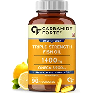 Carbamide Forte Triple Strength Fish Oil 1400mg Omega 3, 900mg Softgel Capsule is a triple strength omega-3 fish oil capsule of exceptional quality and potency. This pharmaceutical-grade fish oil omega-3 capsules for women and men passes a longer list of rigorous tests than normal fish oil. Methods of testing are more advanced and strict about giving the certified quality. These pharmaceutical-grade omega-3 fatty acid capsules consist of rich fish oil purified using molecular distillation to remove heavy metals, PCBs, and other toxins. It’s light and ultra-clean. The molecularly distilled fish oil is clean and burp free. Inferior fish oil capsules use ethyl ester omega-3s. The triple-strength fish oil omega-3 capsule consists of DHA, and EPA is delivered in triglyceride form, proven to be a superior and better-absorbed form of omega-3s.