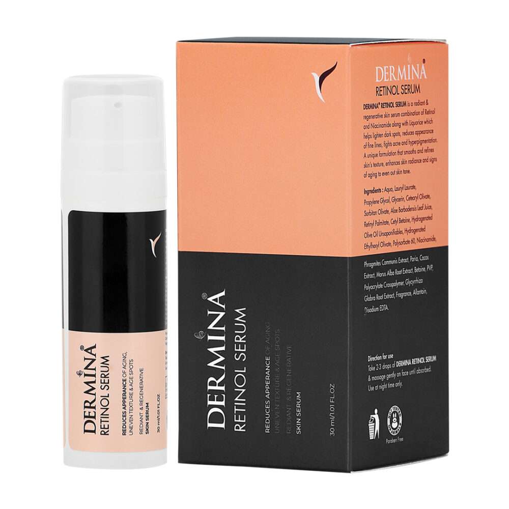 Extremely potent in nature, Dermina’s Retinol serum is formulated with the best ingredients like Niacinamide, and Licorice. A unique formulation with key ingredients like Retinyl Palmitate, Aloe Barbadensis Leaf Juice (aloe vera), Hydrogenated Ethylhexyl Olivate (an ingredient derived from olives) smoothens the skin, enhances its texture, and consistently fights signs of skin aging, and dark spots, and dullness.