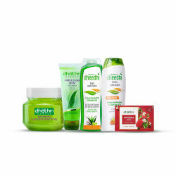 Skin Care for monsoon is unavoidable. Monsoon Skin care products must be a list of all monsoon essentials for your hair, skin and body. This monsoon kit by Dhathri includes the Daily Shampoo for daily shine, Dheedhi Conditioner to maintain the softness of hair, Neemfacewash to keep your face blemish-free, an Aloe vera Gel to keep skin hydrated skin and Oushadha Soap for keeping skin free from allergies and infections. Dheedhi Daily Herbal Shampoo (250ml) is a clinically proven daily use mild shampoo enriched with the goodness of Aloe vera, Coconut Oil Basil Thyme and other natural ingredients to moisturize and nourish the hair. Dheedhi Conditioner (200ml) is an Ayurvedic Conditioner enriched with Coconut Milk, Vitamin E to thoroughly condition and moisturise the hair and keep it free from frizziness. It is safe on the scalp as well. Oushadha Soap (75gms) is decoction soap (kashaya soap) with therapeutic ingredients- red sandalwood, thazhampoov, nagapoov, aloe vera and hibiscus that fights skin allergies, itching, dust, and infections providing skin with complete protection. Pimple Clear Neem Face Wash (100ml) is a 100% soap-free Ayurvedic face wash enriched with Tulsi, Aloe Vera, and Neem. It helps prevent skin troubles, eliminates excess oil, and purifies the skin, leaving it fresh and clean. Moisturising Aloe Vera Beauty Gel (200gms) is an alcohol-free soothing gel to moisturize, soothe and refresh the skin. It maintains the natural oiliness and pH balance of the skin and improves skin tone with regular usage.