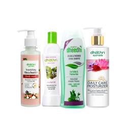 Dhathri nourishing skin kit is an excellent nourishing routine for hair, skin and body. It contains Shea Butter Body Wash to soothe and nourish the body, Daily Care Moisturizer to make skin smooth and glowing, Hair Care Herbal Oil to prevent hair fall and Dheedhi volume & thicknessShampoo to restore protein balance in hair and keep hair healthy.
