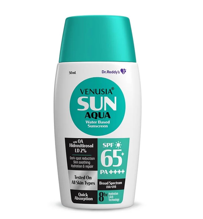 Venusia aqua water based sunscreen SPF 65 with broad spectrum protection - UVA, UVB . Highly suitable for oily and acne prone skin