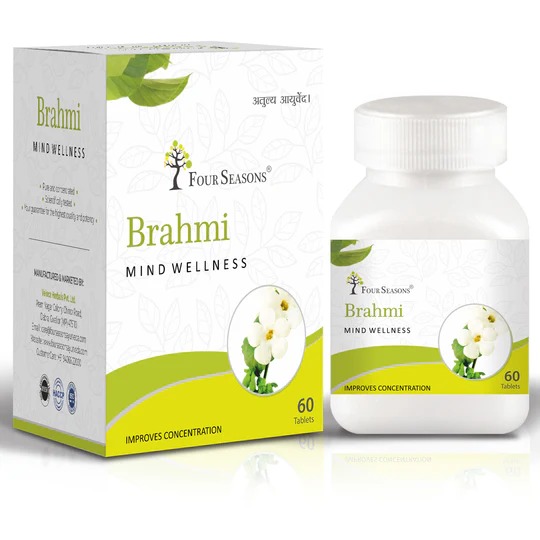 Four Seasons Brahmi Tablet is an Ayurvedic herbal supplement that is believed to have several potential benefits for mental functioning and overall well-being. The tablet contains Brahmi (Bacopa monnieri), an ancient Ayurvedic herb known for its ability to enhance memory power and cognitive function. The tablet is believed to support healthy cognitive functioning by promoting mental clarity, alertness, and overall brain health. Four Seasons Brahmi Tablet are helpful in managing age-related memory loss due to the presence of antioxidants. It may reduce the damage caused because of free radicals and enhance learning and retaining potential in older people. Brahmi helps to balance Vata and gives a calming effect on the nervous system.