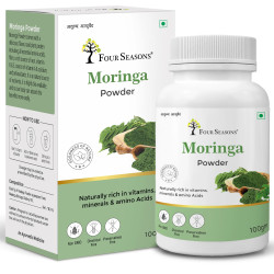 Four Seasons Moringa Powder is a super food that comes with a delicious flavor with 25% plant protein including all 9 essential amino acids, 24% fibre, rich source of iron, vitamin K & E, source of vitamin A & calcium, and antioxidants. It is a natural source of these nutrients, it is highly bioavailable, and so our body can absorb the benefits more easily. The powder is produced by harvesting, drying then milling the leaves of Moringa oleifera. The powder is extremely rich in nutrients. It contains 90 +nutrients and 40 + antioxidants. It is an excellent source of vitamin A, vitamin C, iron, protein, fibre, calcium, magnesium and potassium. Four Seasons Moringa Powder is enriched with Moringa which has high nutritious value. It is enriched with anti-oxidants and vitamins. It has anti-inflammatory properties and also helps in reducing the blood sugar level. It also has aphrodisiac properties and aids in promoting sexual wellness and fertility. It helps in improving overall health and wellness.