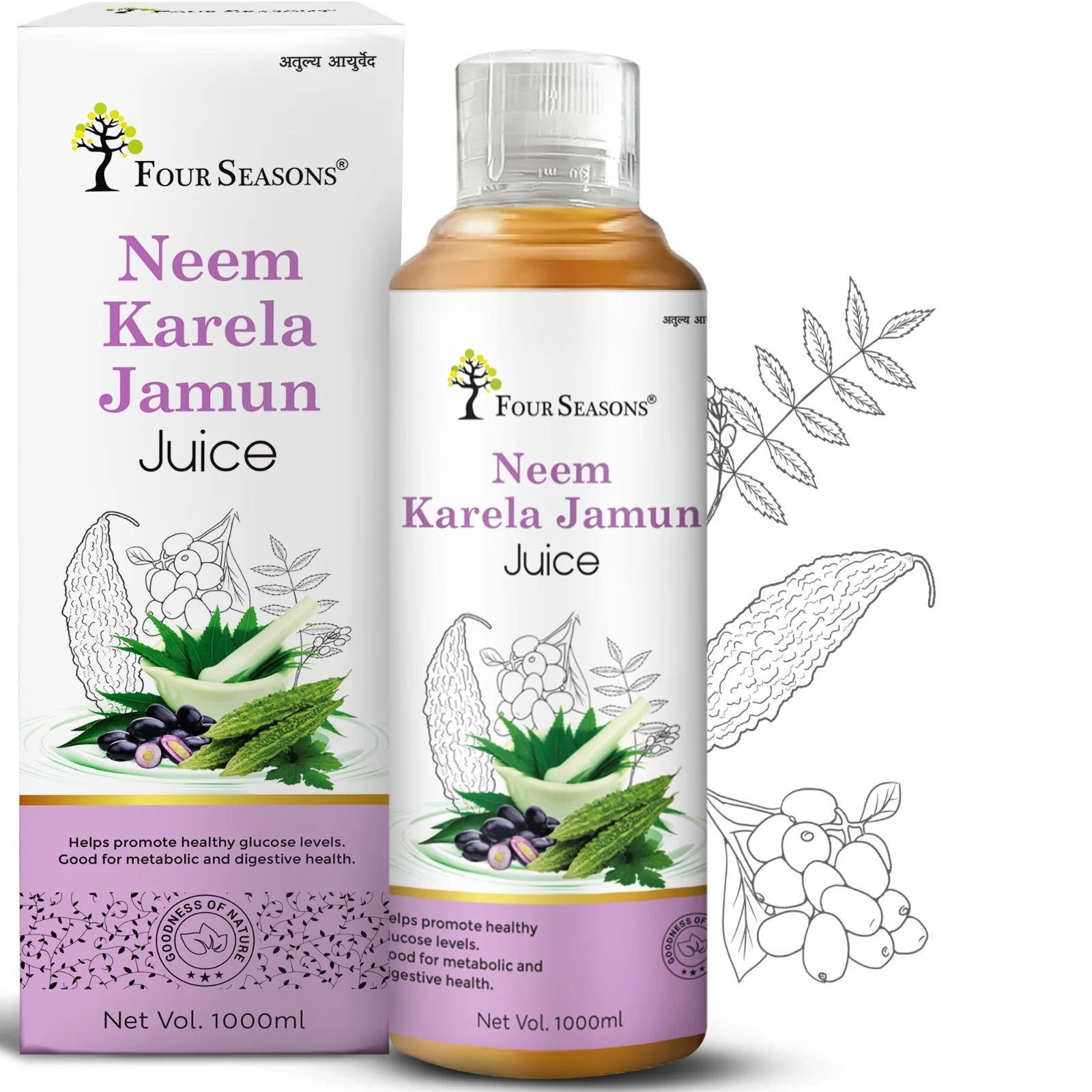 Four Seasons Neem Karela Jamun Juice combines the health benefits of Jamun and Karela Fruits with Neem leaves to help keep up healthy levels of blood sugar. It is an immunity booster which helps promote healthy glucose levels. Neem Karela Jamun is well known Ayurvedic herb to regulate blood sugar level. Rich in phyto-nutrients like minerals, vitamins and antioxidants. With Low calories, this juice has various minerals that are beneficial for digestion and has anti- ageing properties. It not just helps boost the metabolism, but also aids for a healthy weight and is good for your digestive system.