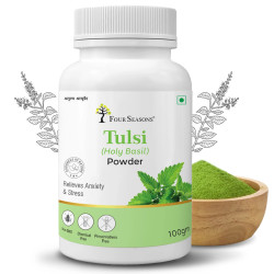 Four Seasons Tulsi Powder is an Ayurvedic remedy that has various health-related benefits. It helps in boosting immunity and provides effective relief from the cough and cold. Stomach related ailments such as flatulence, indigestion can also be relieved by its use. Tulsi powder paste is also effective in healing pimples and acne. Four Seasons Tulsi Powder is formulated with Ayurvedic herb Tulsi. It has antimicrobial, anti-allergic, and anti-inflammatory properties. It is beneficial in treating Asthma, Bronchitis, cough, and flu and also helps in regulating cholesterol levels. It helps in detoxification of the body and also provides relief from stress. It has antioxidant properties and is also useful in boosting natural immunity. Four Seasons Tulsi Powder is a 100% natural tulsi powder. Also known as “holy basil,” tulsi is rich in vitamins and minerals like A, C and K, calcium, magnesium, phosphorus, iron and potassium. It stimulates and vitalises your body.