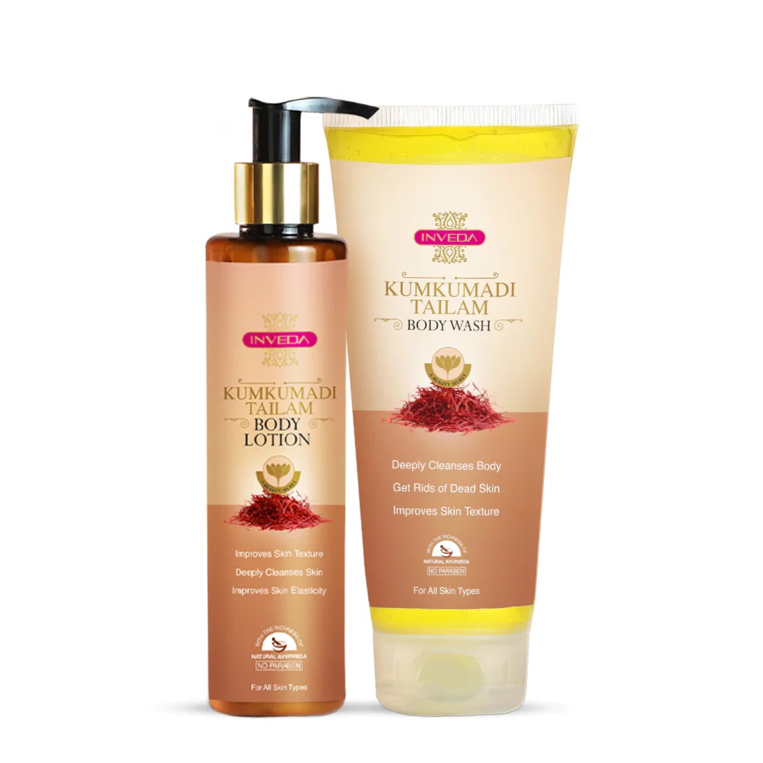 Make your showers more fun and luxurious with Kumkumadi Body Care Duo that cleanses and brightens! Inveda Kumkumadi Tailam Body Lotion & Body wash is curated with goodness of natural ingredients that soothes your skin and replenishes it.