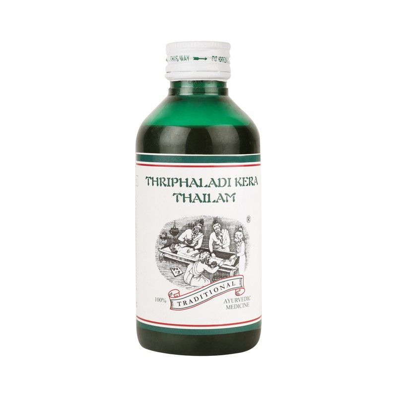 Thriphaladi Kera Thailam can be used as hair oil. Regular massage of the scalp helps to strengthen the roots of the hair and treats split hair. A head massage with Thriphaladi Kera Thailam helps in getting relief from headaches.