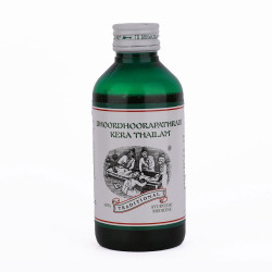 The regular application of this oil to the hair helps in eliminating dandruff from the hair and promotes the growth of good, healthy and lustrous hair. The oil is especially beneficial for children when applied to head and body. The use of Dhoordhoorapathradi Kera Thailam should be restricted to external application only. This oil is not for internal administration. The oil is to be applied to the roots of the hair, onto the scalp and to the length of the hair and then gently massaged into the scalp. For best results, it should be applied at night, kept overnight and then washed off the next morning. The oil can be applied even half an hour before taking a head bath for those who do not want to keep it overnight. While using this oil, one should also take care to maintain a good and healthy diet. Ready made and packed foods and alcohol should be avoided. The hair should also be protected against exposure to strong sunlight.