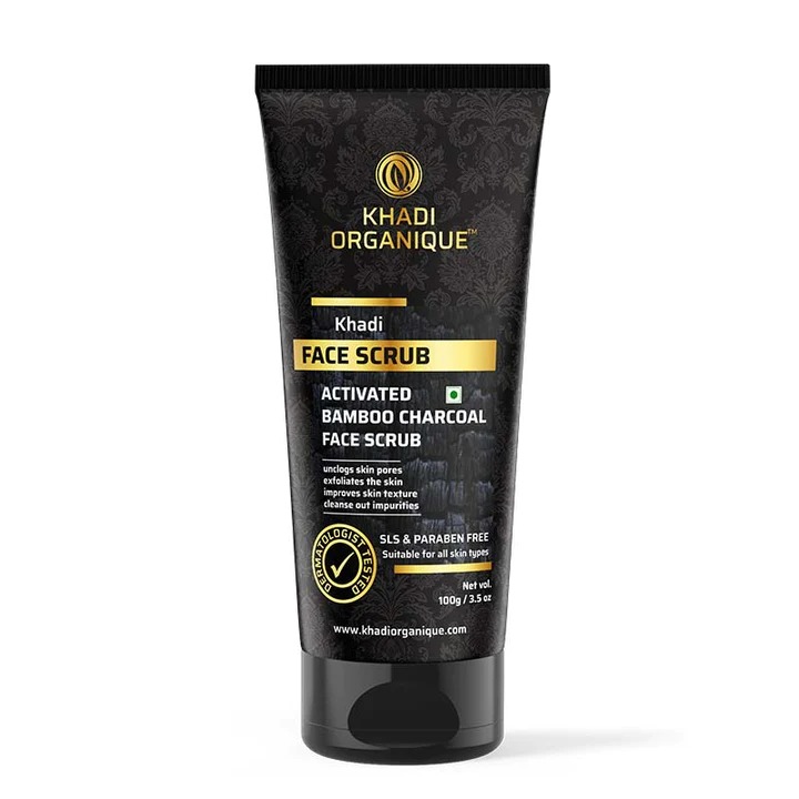 This KHADI ORGANIQUE ACTIVATED BAMBOO CHARCOAL FACE SCRUB - SLS And Paraben Free gently cleanses your skin without stripping off the moisture. It has absorbent properties that suck our dirt & impurities from the skin which helps unclog your skin pores; exfoliation gets rid off the dead skin that makes your skin appear dull & helps your skin appear refreshed & renewed. This face scrub loaded with antioxidants helps to protect you from free radicals. Lavender & Peppermint Oil has soothing & cooling abilities that facilitates oil secretion for achieving healthy & radiant skin.