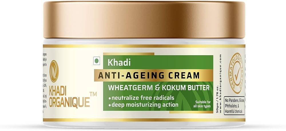 KHADI ORGANIQUE ANTI- AGING CREAM specially designed with multivitamins and enzymes fights with signs of ageing, protect the skin by neutralizing free-radicals and promote elasticity in your skin. Enriched with Kokum Butter and Wheatgerm Oil acts as deep moisturizing agent for nourishing without clogging the pores of skin.