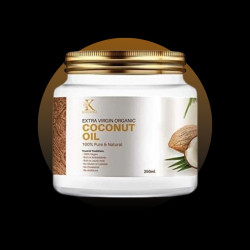 Extra Virgin Coconut Oil as it has anti-bacterial and anti-inflammatory property that helps heal skin breakouts, remove scars/blemishes, and act as the best makeup remover. Its rich nutritional value helps strengthen the hair roots and resolves hair problems like dandruff, hair fall, and hair greying/whitening by doing a head massage twice a week.