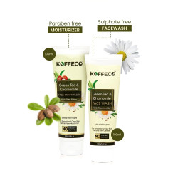Experience the power of Green Tea & Chamomile for glowing skin! Koffeco's Natural Face Wash & Moisturizer Duo instantly hydrates, brightens, and soothes your skin Website Description (bullet points): Thoroughly cleanse and hydrate with Koffeco Green Tea & Chamomile Face Wash Nourish and revitalize your skin with Koffeco Green Tea & Chamomile Face Moisturizer Hydrates and reveals a bright, light glow from the inside out Green tea and chamomile extracts soothe, brighten, and offer antimicrobial benefits Lightweight formulas with antioxidant properties for youthful-looking skin Combat dryness, promote a balanced complexion, and prevent signs of aging