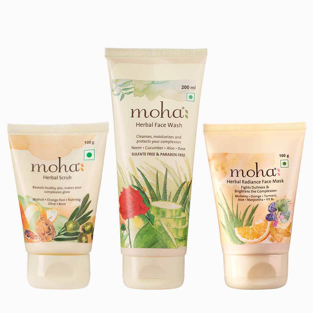 moha: Herbal Radiance Face Mask (100gm): is a smooth textured formula powered with antioxidants like Mulberry & Vitamin B3 which reduces dullness and delays signs of ageing. Orange enriched with Vitamin-C brightens up the skin, Manjistha reduces tan, impurities and blemishes. Turmeric, known for skin-lightening benefits, helps enhance skin tone and Aloe Vera makes skin soft & smooth.