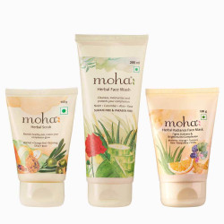 moha: Herbal Face Wash (200ml): enriched with natural ingredients like Aloe, Cucumber, Rose, Neem and Yashtimadhu effectively cleanses deep-seated dirt, oil and impurities, maintaining its natural moisture and glow. This moisturising facewash helps to soften skin and prevent dryness.
