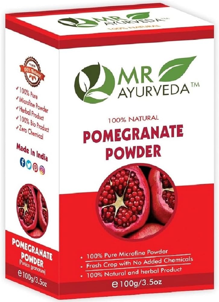 MR Ayurveda Pomegranate Peel Powder is made from Natural Fresh Crop. The Triple Sifted Microfine Powder is 100% Pure and Contains No added Harmful Ingredients. This Product can be effectively put to use for both the purposes of Hair & Face Care. Key Features: 1. Made from the Natural Goodness of Fresh Crops 2. Completely Herbal in Nature 3. Absolutely Pure and does not contain any traces of added Chemicals 4. 100% Organic Product constituting Natural Herbs 5. 100% Bio in Nature. Main Benefits: 1. Wonderful Product for Natural Looking Glowing Skin 2. Exfoliates Skin, Helps Replenish Dry & Dull Skin 3. Fights Acne, Pimples & Rashes and it acts as a Natural Moisturiser 4. Prevents Wrinkles and Other Signs of Skin Ageing 5. Arrests Hair Loss, Prevents Dandruff & Promotes Healthy Hair Growth 6. Strengthen Dull Strands & Gives Hair a Natural Gloss. How to Apply: Add 2 Tablespoon of Honey and 1 Tablespoon of MR Ayurveda Pomegranate Powder. Mix it into a Smooth Paste. Apply it evenly on Face and Neck. Let it Stay for 15-20 Minutes and later rinse it with Lukewarm Water. Repeat 2-3 times Weekly. Works Wonder for All types of Skin. ...Read Less