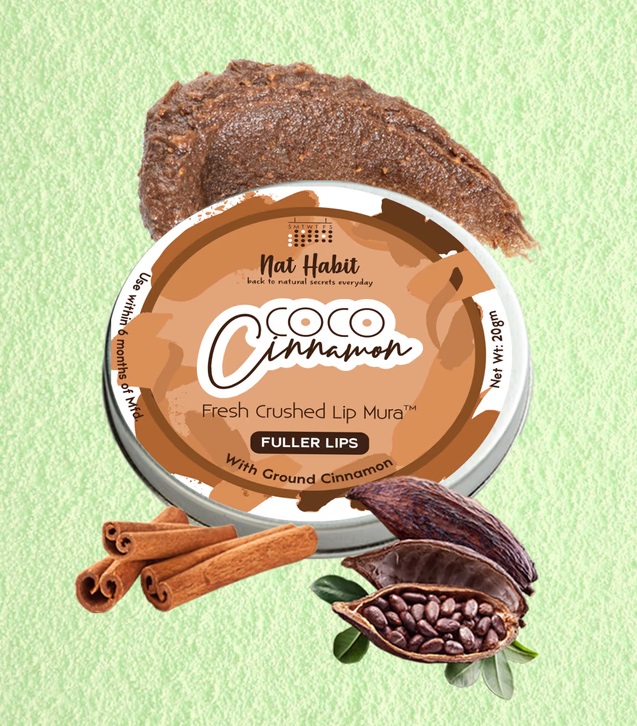 Kitchen fresh exfoliating Lip Mura for lush, full & soft lips. The Coco Cinnamon lip mura is made of ground cocoa, roasted cinnamon, desi cow ghee, eucalyptus honey, shea butter & pure cold pressed oils for fuller soft lips. ZERO chemicals & preservatives. ZERO mineral oil & paraffins.