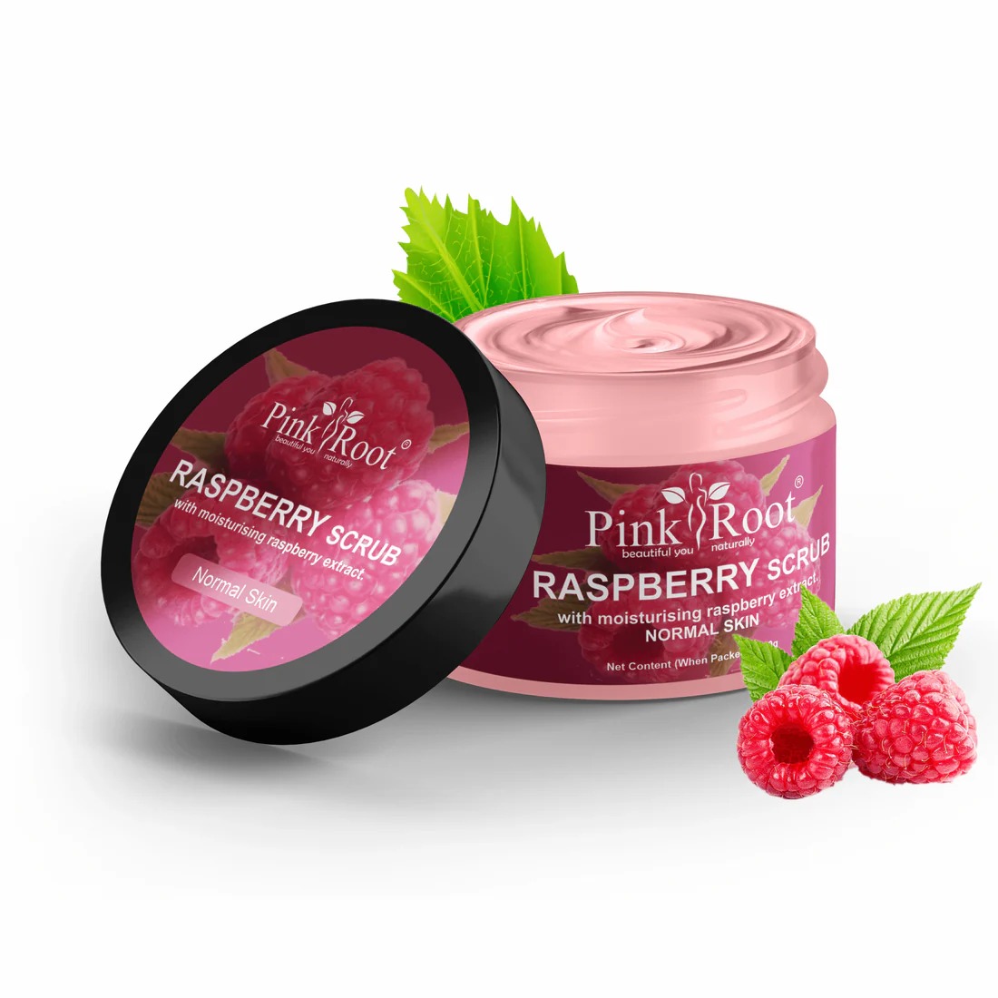Pink Root Raspberry Scrub with raspberry seeds, the scrub has a lovely pulpy texture that gently exfoliates your skin, leaving it feeling cleansed, refreshed and smelling like a punned of raspberries.