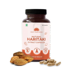 Saptamveda's Natural Haritaki Capsules is a natural herbal supplement and contains the goodness of high quality Haritaki ( Terminalia chebula ) in form of 500mg capsules. Haritaki is an Ayurvedic herb that has been used for thousands of years to build, strengthen, rejuvenate, and revitalize the whole body. Haritaki has a gentle cleansing action in the digestive tract and encourages healthy elimination and regularity.