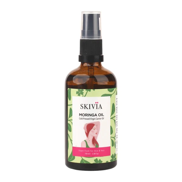 Skivia Moringa Carrier Oil is extracted from the seeds of the moringa tree through the cold-pressed method which ensures that its nutrients remain intact. It contains antioxidants, anti-inflammatory, anti-bacterial, anti-fungal, and anti-aging properties. It helps in moisturizing and cleansing the skin & enhances hair health