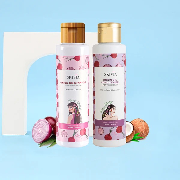 Skivia Onion+Keratin Shampoo & Conditioner Set contains Skivia Onion Oil Shampoo (100 ml) & Skivia Onion Oil Conditioner (100 ml). Skivia Onion Oil Shampoo is a boon for dry & dull hair. It strengthens the hair strands by providing nourishment till deep within & improves the overall texture of your hair. It helps in boosting hair growth & curbs hair fall. It makes your locks lustrous, smooth & manageable and helps to get rid of a host of hair problems like frizziness, split ends & hair thinning. Skivia Onion Oil Conditioner works wonderfully well in protecting the hair strands from environmental damage by creating a natural barrier besides making them soft & manageable. Since onion oil contains high amounts of sulphur, it is considered one of the best ingredients for stronger & thicker locks. Coconut & sunflower oil