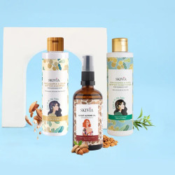 Skivia Professional Hair Care Range contains Skivia Macadamia & Shea Butter Shampoo (200 ml), Skivia Macadamia & Shea Butter Conditioner (200 ml) & Skivia Sweet Almond Carrier Oil (100 ml). Skivia Macadamia & Shea Butter Shampoo is a boon for people with dry & damaged hair. It gently cleanses the scalp while keeping it moisturized & nourished. This shampoo is enriched with natural ingredients that improve the texture of your tresses & reduce dryness & frizz besides maintaining scalp health & keeping infections at bay. Skivia Macadamia & Shea Butter Conditioner is enriched with the goodness of macadamia & shea butter. It has a lightweight formula that makes your hair healthy, nourished & vibrant without leaving a heavy feeling on your hair. This conditioner revitalizes dry & damaged hair and makes it soft & manageable. Skivia Sweet Almond Carrier Oil is extracted through the cold-pressed method which maintain its integrity. This oil is a powerhouse of fatty acids, vitamins & minerals. It helps in making the hair stronger & healthier & enahnces the overall appearance & health of the hair.