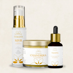 Svarasya’s ‘Suvarana - Ultimate Skin Hydration Ritual for Dry & Anti-Aging Skin’ ritual deeply hydrates and rejuvenates the skin, enhancing its natural glow while protecting it from environmental damage. The ritual combines the detoxifying power of Chandrika, the brightening and hydrating properties of Tejasya, and the protective benefits of Nivr to provide a comprehensive skincare routine for dry, aging skin.