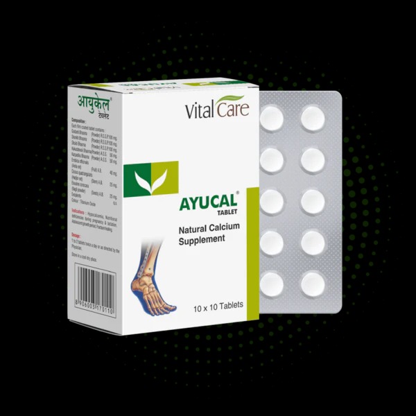 Ayucal is a natural supplement for calcium developed by the Vital Care research and development team. It is made of ayurvedic herbs such as Shankh Bhasma that offers a biologically active natural form of calcium that is easily absorbed by the body. It enhances calcium absorption. ensures optimum calcium availability during pregnancy, lactation, and growing stages in children.