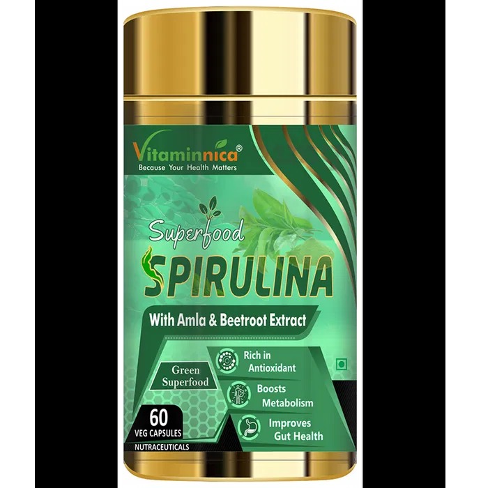 Vitaminnica Superfood Spirulina Veg Capsule is a superfood with a remarkable ability to synthesize concentrated food efficiently. It is loaded with 60% highly digestible protein. It is a potent source of nutrients and helpful in allergies. It boosts the immune system and reduces stress naturally.