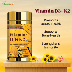 Vitaminnica Vitamin D3+K2 Veg Capsule can help perform various essential functions related to bone formation in the human body. Vitamin D3 is a supplement that helps the body absorb calcium. The Vitamin D3 capsules help to raise overall vitamin D levels more than D2. Vitamin D can help to reduce the risk of heart failure and improves heart function. The capsules support healthy calcium levels in the blood and help restore cardiovascular health. It also helps keep the teeth healthy and strengthens the bones.