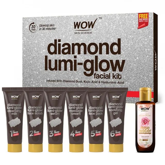 Gives Instant Brightness to Face: Restore brightness to your tired & ageing skin with WOW Skin Science Diamond Facial Kit. This 6-step facial kit delivers the goodness of activated naturals like diamond dust, kojic acid and hyaluronic acid. This diamond facial kit gives you salon-like facial at home in just 30 minutes. Regular use of this facial kit removes skin-dulling dead skin layer, smoothens complexion and infuses it with a diamond shine.